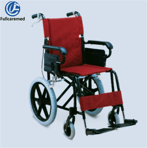 Transit wheel chair, aluminum light weight chair frame,8” solid MAG rear wheel,5” solid castor,Flip-up armrest and footrest,drop back handle with united brake and seat belt.