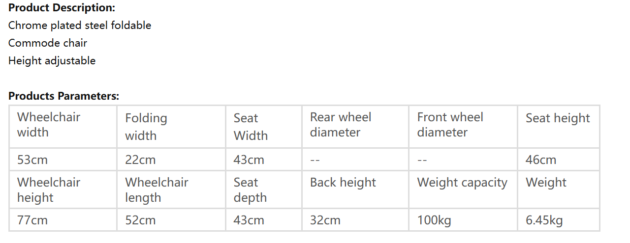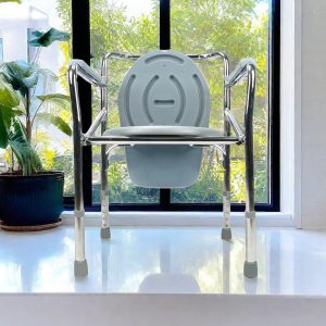 The commode could be folded and put in the toilet or room corner. The folding width is only 15cm, covering little space. The height is ajustable, fit for different people’s need.